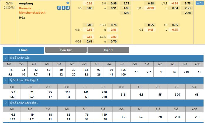 Bảng tỷ lệ kèo trực tuyến trận đấu Augsburg vs Monchengladbach: