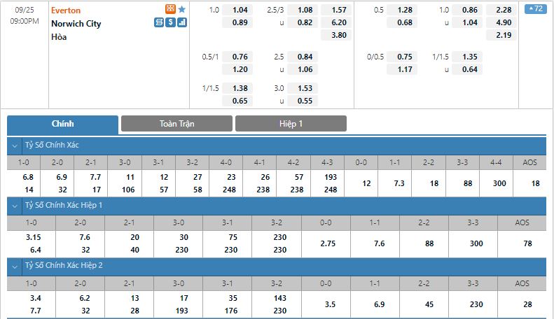 - Kèo tỉ số hiệp 1: Everton 1-1 Norwich