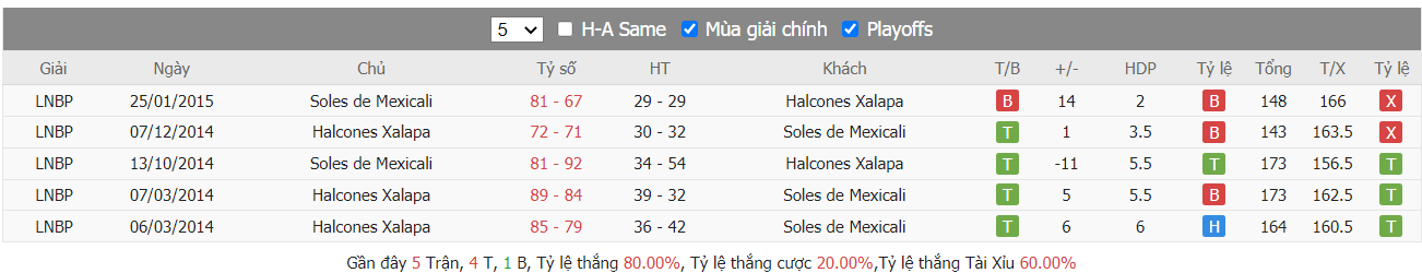 Phong độ gần đây Halcones de Xalapa vs Soles de Mexicali