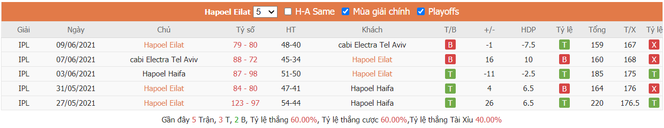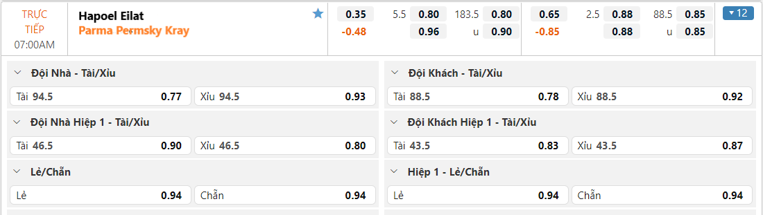 Bảng tỷ lệ kèo Hapoel Eilat vs Parma Permsky Kray
