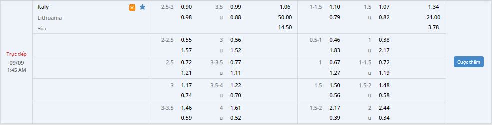 Bảng tỷ lệ kèo trực tuyến trận đấu Italy vs Lithuania