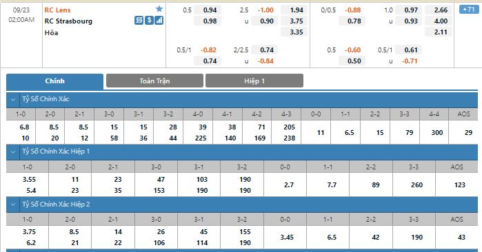 Bảng tỷ lệ kèo trực tuyến trận đấu Lens vs Strasbourg:
