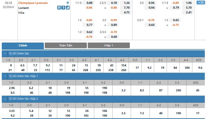 Bảng tỷ lệ kèo trực tuyến trận đấu Lyon vs Lorient: