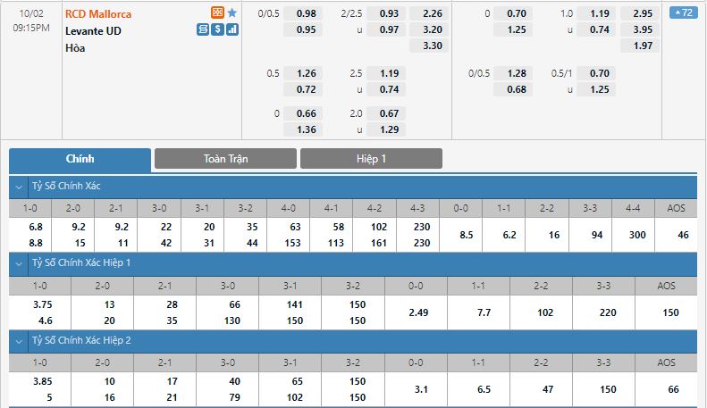 - Kèo tỉ số hiệp 1: Mallorca 0-0 Levante