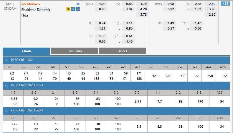 Bảng tỷ lệ kèo trực tuyến trận đấu Monaco vs Shakhtar Donetsk