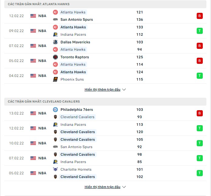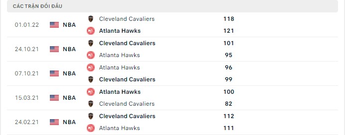 Phong độ gần đây Atlanta Hawks vs Cleveland Cavaliers