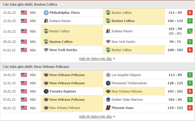 Phong độ gần đây Boston Celtics vs New Orleans Pelicans