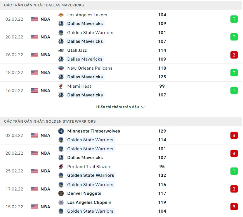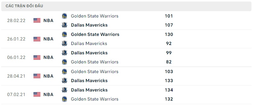 Phong độ gần đây Dallas Mavericks vs Golden State Warriors