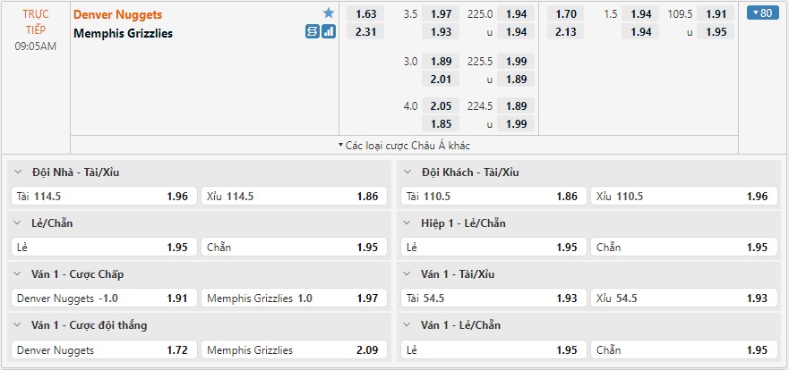 Bảng kèo Denver Nuggets vs Memphis Grizzlies