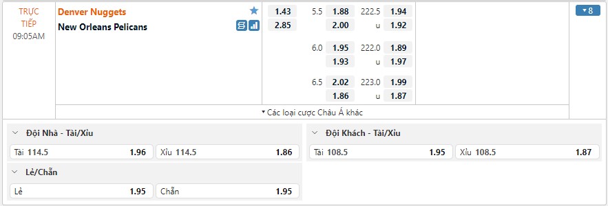 Bảng kèo Denver Nuggets vs New Orleans Pelicans