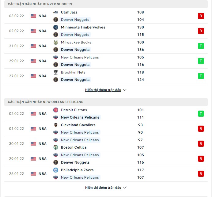 Phong độ gần đây Denver Nuggets vs New Orleans Pelicans