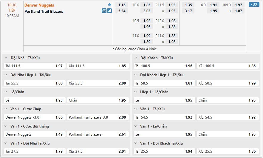 Bảng kèo Denver Nuggets vs Portland Trail Blazers