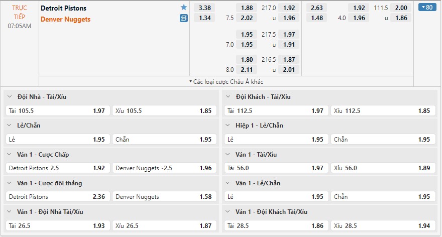 Bảng kèo Detroit Pistons vs Denver Nuggets