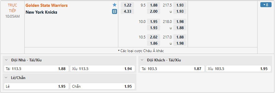 Bảng kèo Golden State Warriors vs New York Knicks