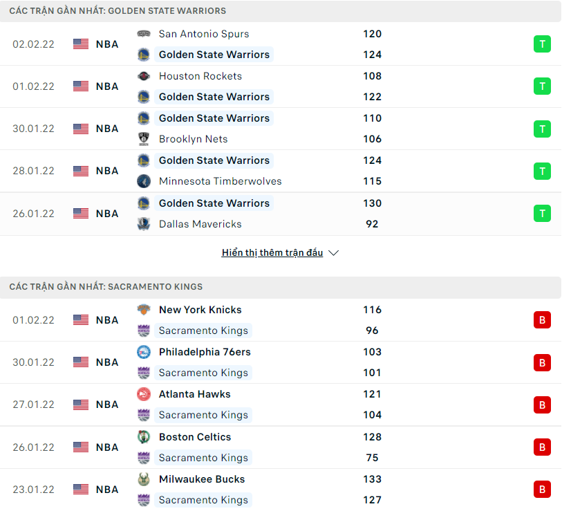 Phong độ gần đây Golden State Warriors vs Sacramento Kings