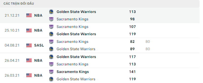 Golden State Warriors đã thắng cả 2 trận trước đối thủ trong mùa giải năm nay với lần lượt những tỷ số 119-107 và 113-98. Trận đấu diễn ra trước thềm giáng sinh năm ngoái chứng kiến thế trận một chiều được Cầu Vàng tạo ra khi có được sự tăng tống bất ngờ trong 12 phút cuối cùng. Stephen Curry đã có một ngày thi đấu thăng hoa với 30 điểm, 3 rebound và 4 kiến tạo. Thời điểm đó Warriors còn mất Poole, Wiggins và Thompson vì chấn thương khiến cho sự xuất hiện của họ trong cuộc đối đầu thứ 3 mùa này càng làm chênh lệch giữa 2 đội thêm phần lớn hơn. Về phía của Kings trong ngày hôm đó cũng thiếu vắng tới 6 cái tên vì lý do dịch bệnh, trong đó vắng đi những cầu thủ quan trọng như Fox, Holmes và Bagley. Với khả năng ra sân bỏ ngỏ của Fox trong trận tới thì những cái tên còn lại như Barnes, Hield và Halliburton sẽ chia sẻ trọng trách ghi điểm. Tyrese Halliburton trong trận đấu đó chính là tay ghi điểm tốt nhất bên phía Kings với 24 điểm, 4 rebound và hoàn tất cú Double Double với 11 kiến tạo. Warriors chắc chắn là cái tên có tới 90% tỷ lệ chiến thắng trong trận đấu sắp tới, khi mà các trụ cột của họ có phong độ cao và cũng vừa có được một vòng đấu xả hơi quý giá.
