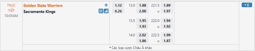 Bảng kèo Golden State Warriors vs Sacramento Kings