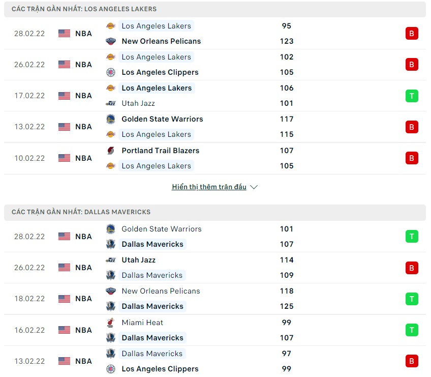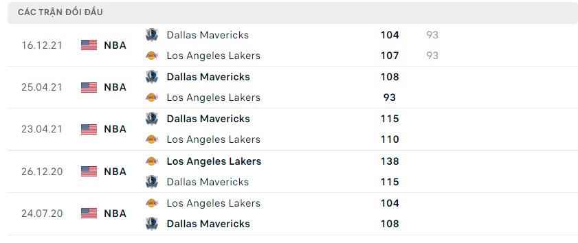 Phong độ gần đây Los Angeles Lakers vs Dallas Mavericks