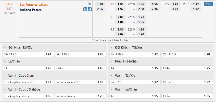 Bảng kèo Los Angeles Lakers vs Indiana Pacers