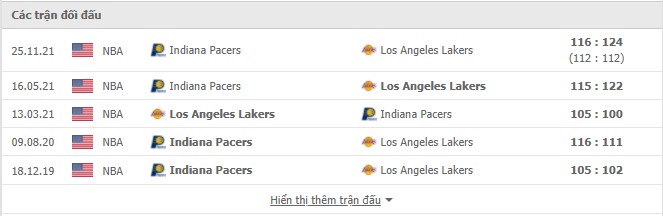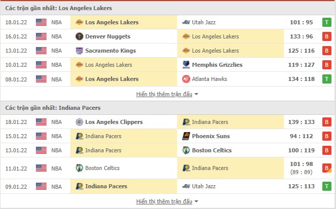 Phong độ gần đây Los Angeles Lakers vs Indiana Pacers