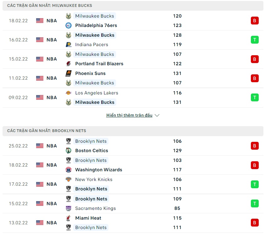Phong độ gần đây Milwaukee Bucks vs Brooklyn Nets