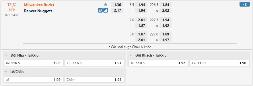 Bảng kèo Milwaukee Bucks vs Denver Nuggets