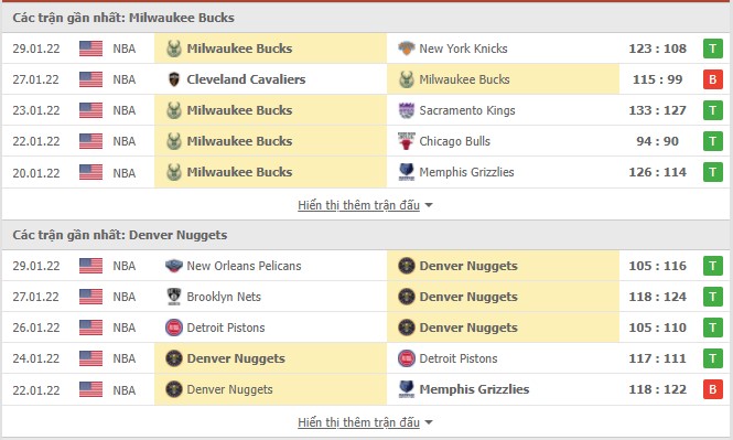 Milwaukee Bucks hiện đang đứng ở vị trí thứ 4 trên BXH miền Đông với 31 chiến thắng và 20 thất bại kể từ đầu mùa. Bầy Hươu chỉ có được 5 chiến thắng trong 10 trận gần nhất nhưng 4 trong số này đến trong 5 trận gần đây, cho thấy những sự cải thiện về phong độ của Giannis cùng các đồng đội. Denver đang đứng thứ 6 tại liên đoàn miền Tây với 27 chiến thắng và 21 thất bại, bám sát Dallas ở phía trên và sẵn sàng cho một cú soán ngôi trong vòng đấu tới đây. Sự ổn định hơn từ khả năng ghi điểm khiến Thợ Mỏ đang có chuỗi trận thăng hoa.
