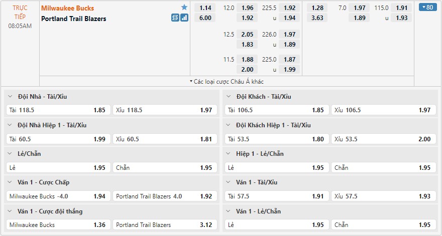 Bảng kèo Milwaukee Bucks vs Portland Trail Blazers