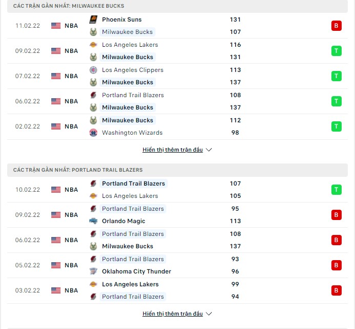 Phong độ gần đây Milwaukee Bucks vs Portland Trail Blazers