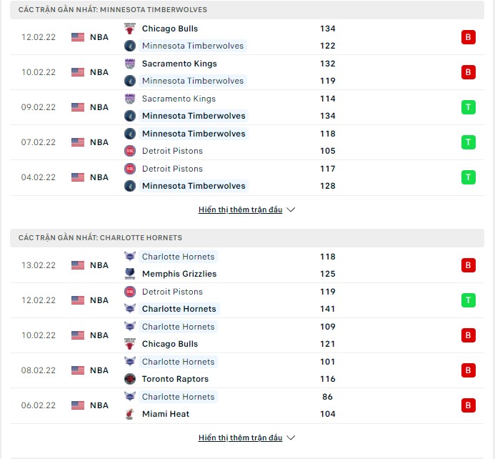 Phong độ gần đây Minnesota Timberwolves vs Charlotte Hornets