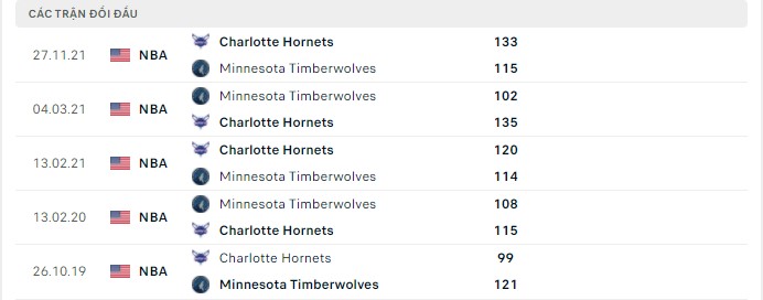 Lịch sử đối đầu Minnesota Timberwolves vs Charlotte Hornets