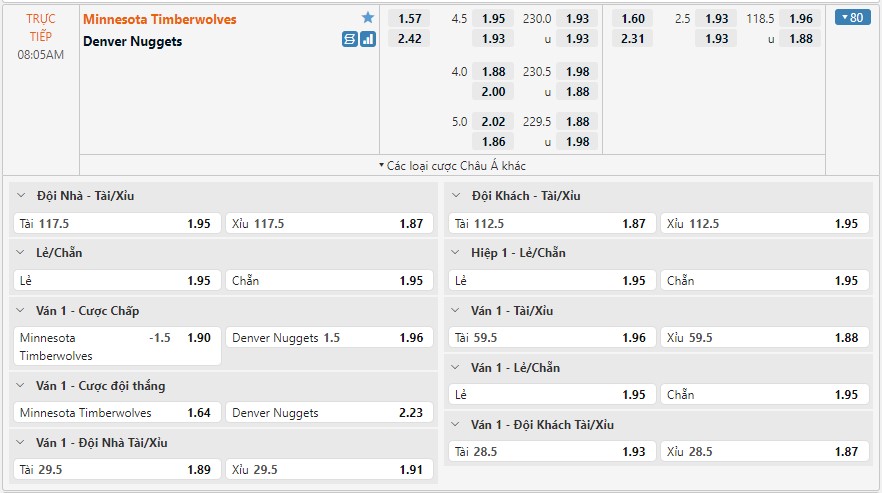 Bảng kèo Minnesota Timberwolves vs Denver Nuggets