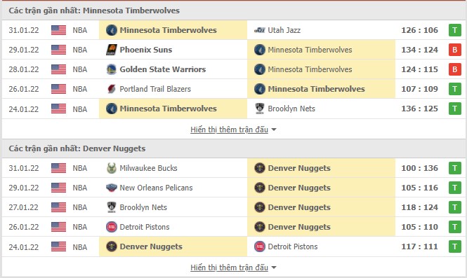 Phong độ gần đây Minnesota Timberwolves vs Denver Nuggets