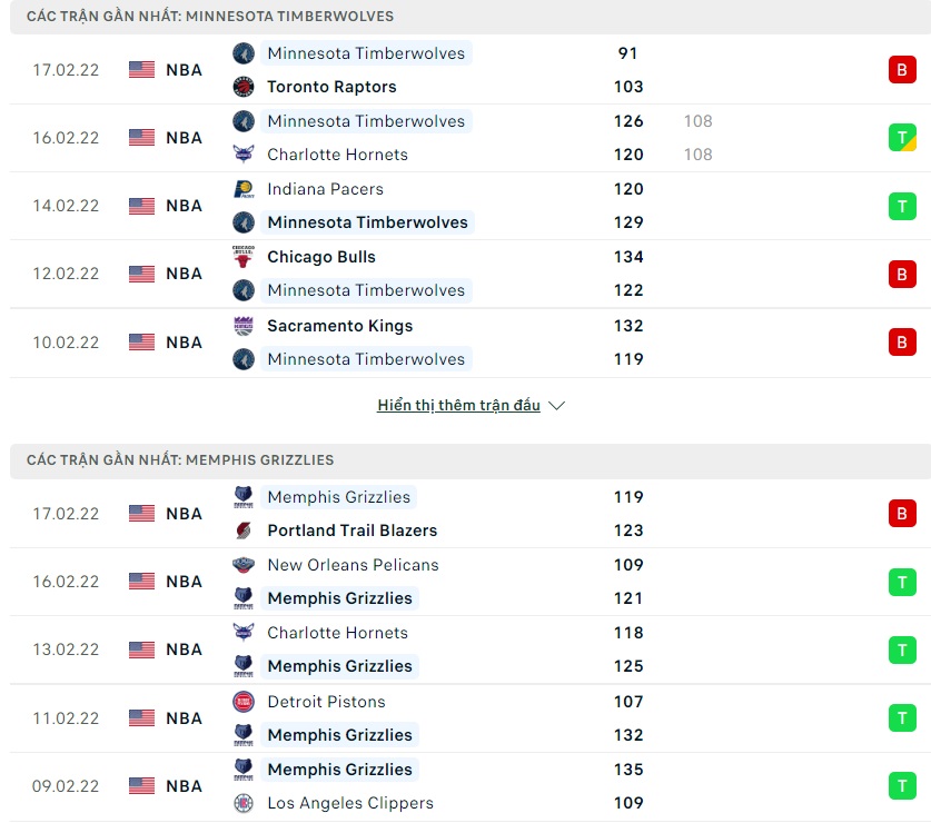 Phong độ gần đây Minnesota Timberwolves vs Memphis Grizzlies
