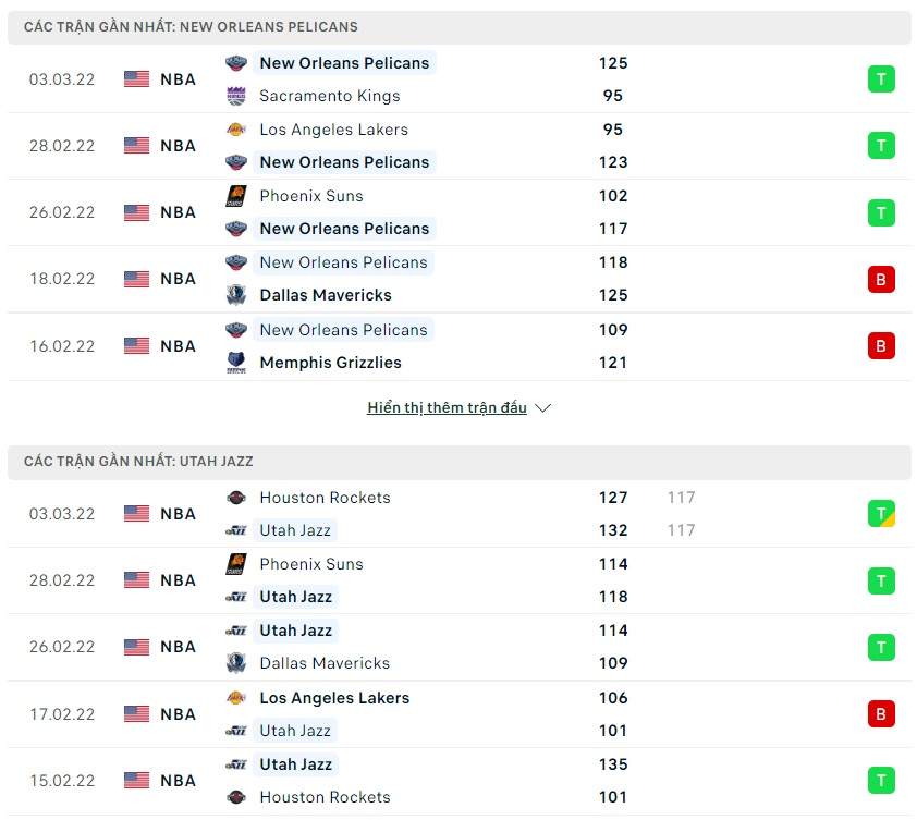 Phong độ gần đây New Orleans Pelicans vs Utah Jazz