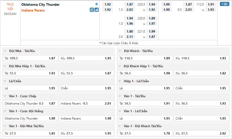 Bảng kèo Oklahoma City Thunder vs Indiana Pacers