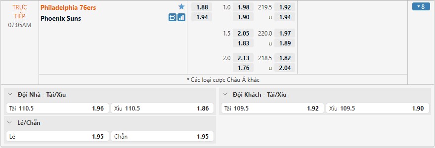 Bảng kèo Philadelphia 76ers vs Phoenix Suns
