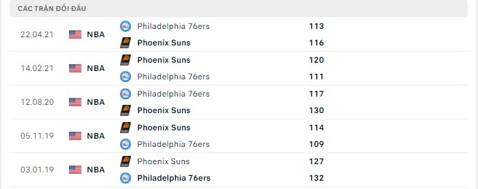 Lịch sử đối đầu Philadelphia 76ers vs Phoenix Suns