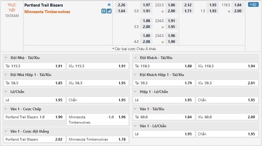 Bảng kèo Portland Trail Blazers vs Minnesota Timberwolves