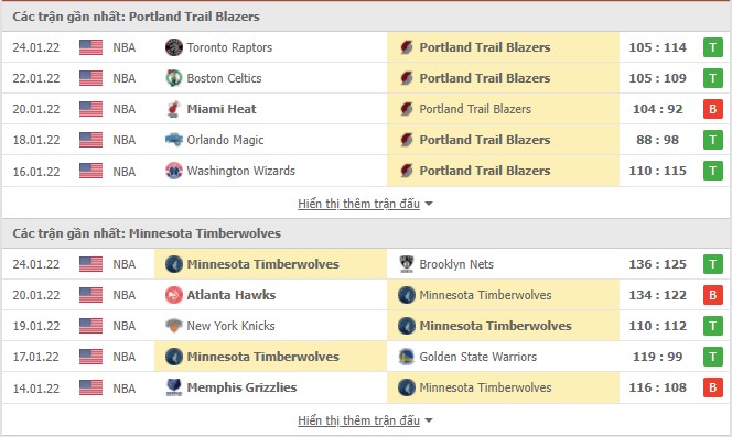Phong độ gần đây Portland Trail Blazers vs Minnesota Timberwolves