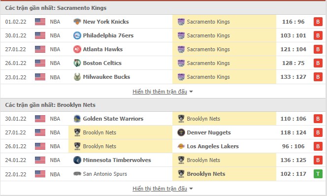 Phong độ gần đây Sacramento Kings vs Brooklyn Nets