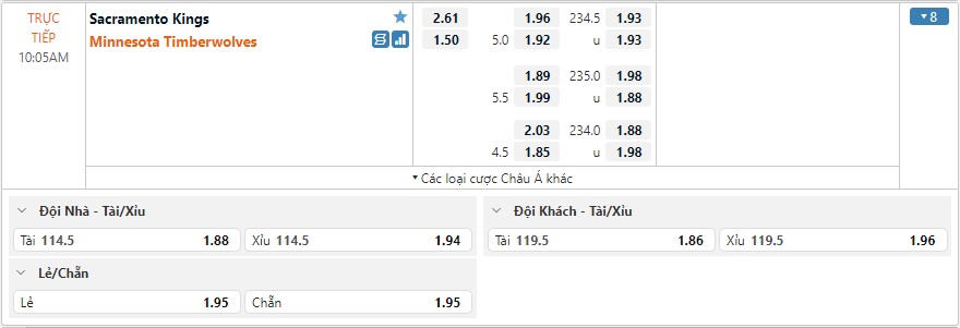 Bảng kèo Sacramento Kings vs Minnesota Timberwolves