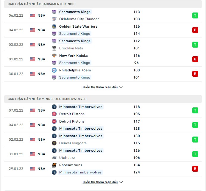 Phong độ gần đây Sacramento Kings vs Minnesota Timberwolves