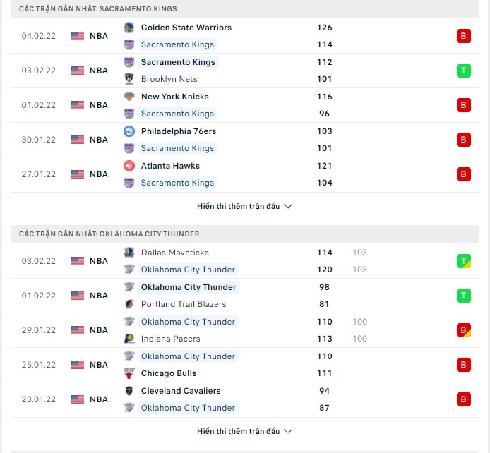 Phong độ gần đây Sacramento Kings vs Oklahoma City Thunder