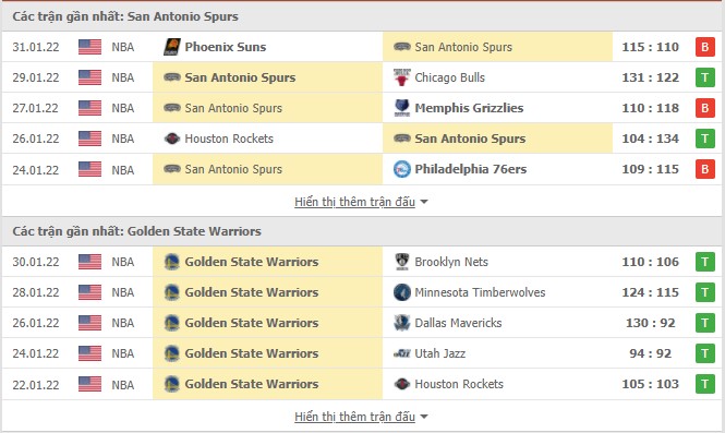 Phong độ gần đây San Antonio Spurs vs Golden State Warriors