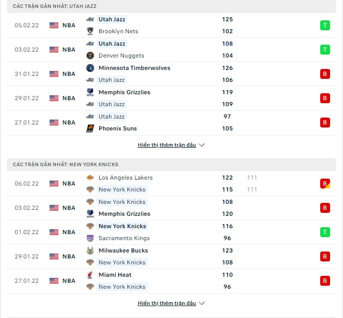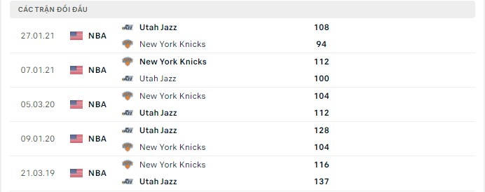 Phong độ gần đây Utah Jazz vs New York Knicks