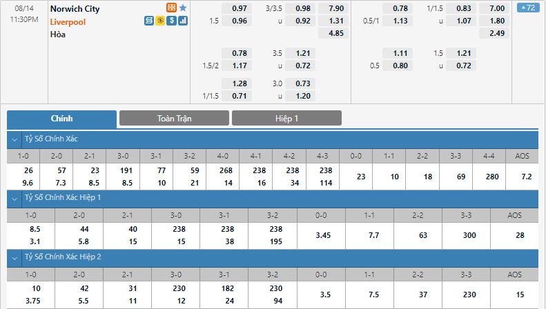 - Kèo tỉ số hiệp 1: Norwich 0-1 Liverpool