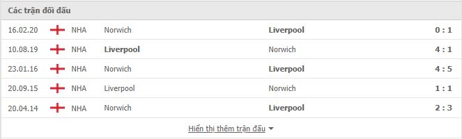 Thành tích đối đầu Norwich vs Liverpool