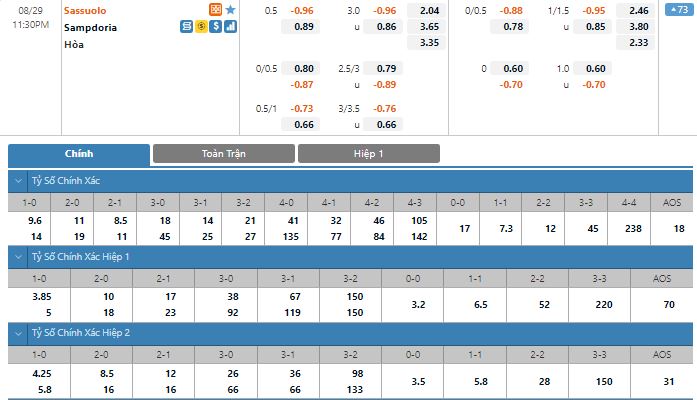 Bảng tỷ lệ kèo trực tuyến trận đấu Sassuolo vs Sampdoria: