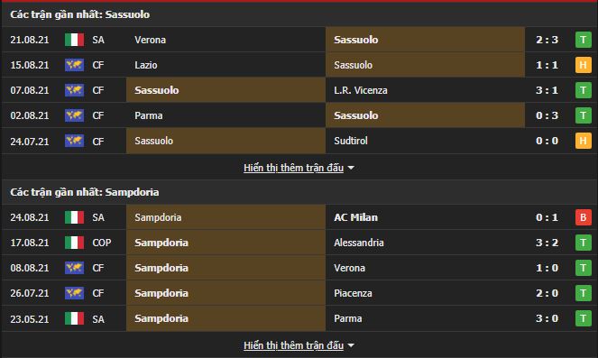 Phong độ gần đây Sassuolo vs Sampdoria: